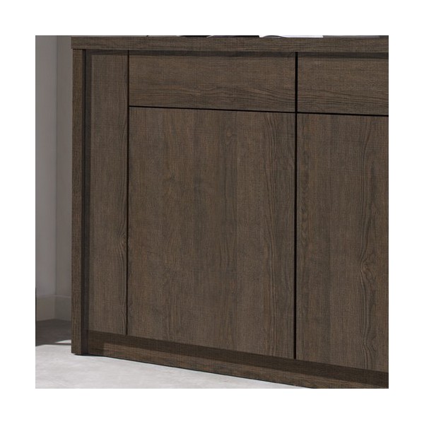 Ce buffet design est classe avec son placage mélaminé imitation chêne foncé. Il habille élégamment votre salle à manger.Il est aussi pratique grâce à ses nombreux rangements. Vous pouvez y placer votre vaisselle, vos torchons ou serviettes et même vos livres de cuisine. Le plus de ce buffet est qu'il contient deux espaces de rangement pour vos bouteilles d'apéritifs ou de vin, ce qui est pratique pour les avoir à portée de main pendant l'apéro ou le repas.